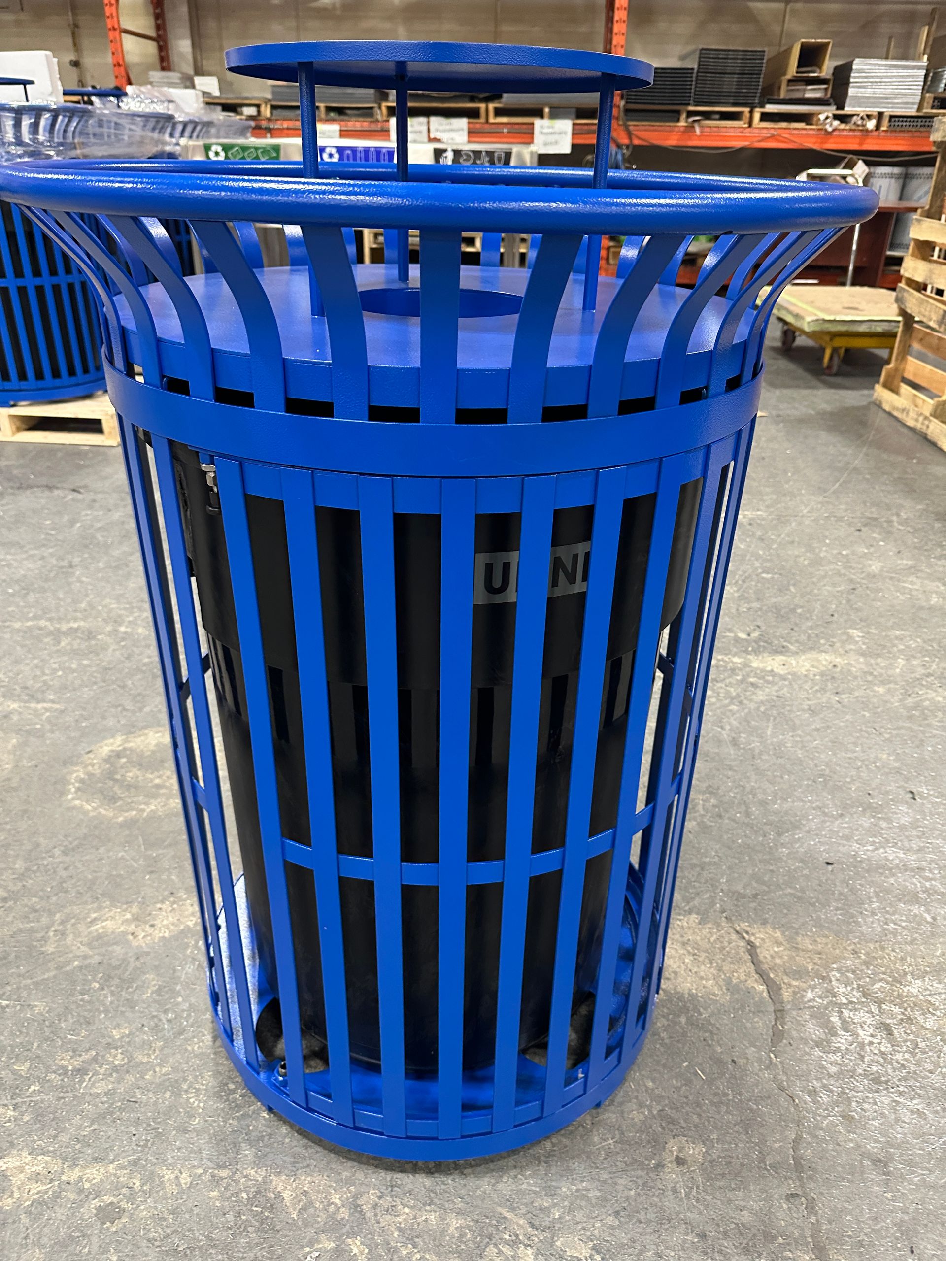 Outdoor 2 stream bin with rotationally molded base for corrosion resistance.